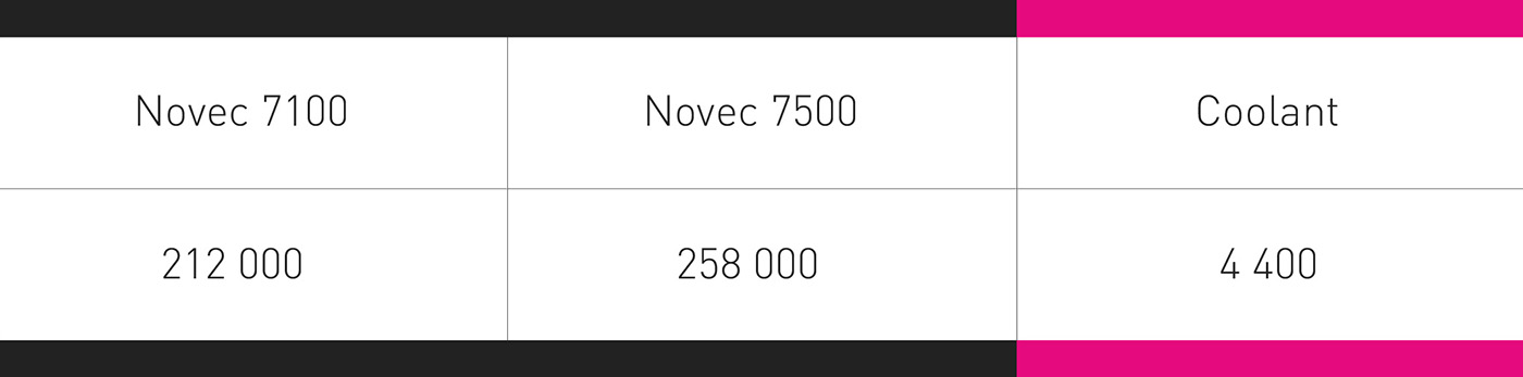 There are also several technical nuances here that are related to the volatility achieved at high temperatures and heat transfer. Novec 7300 and 7500 are used mostly used in single phase cooling systems.