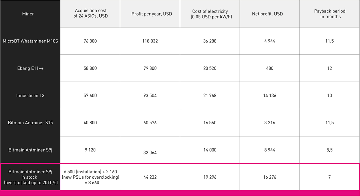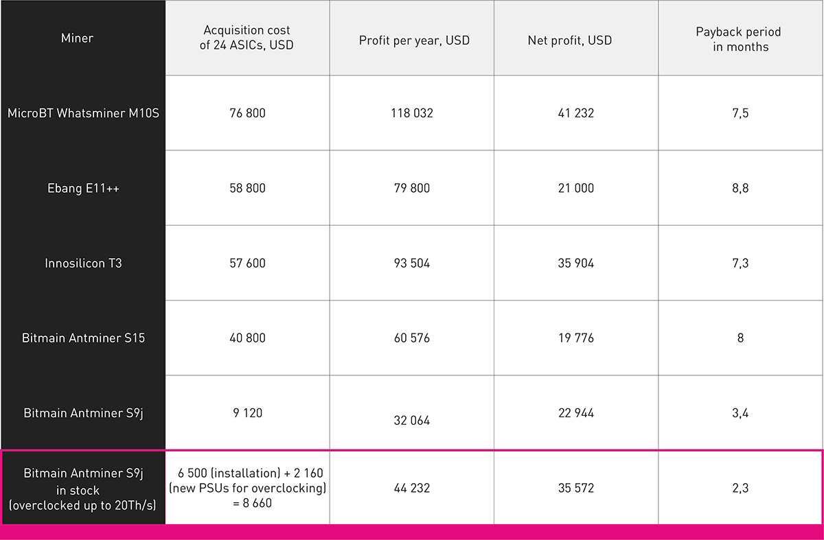 Thus, when buying new ASICs, the payback period is longer than when using existing equipment that is overclocked based on immersion cooling. Payback period is reduced by 20-40%.