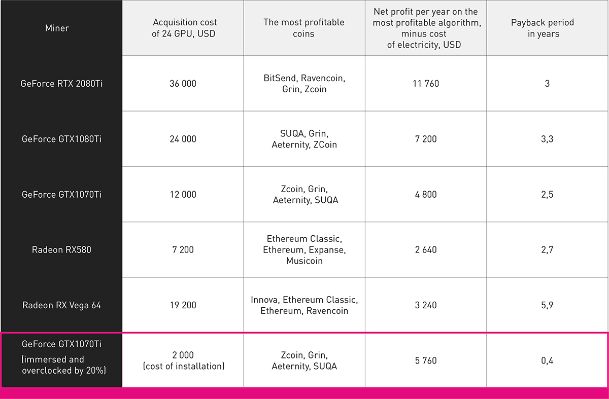 Mining with video cards can hardly be called a good idea in 2019. Payback periods are measured in years and mineable coins aren’t very profitable. Let’s compare the profit of 24x high-end GPUs with 0.05 USD per 1 kW/h electricity rate to the profit you can get from old GPUs when applying immersion cooling technology.