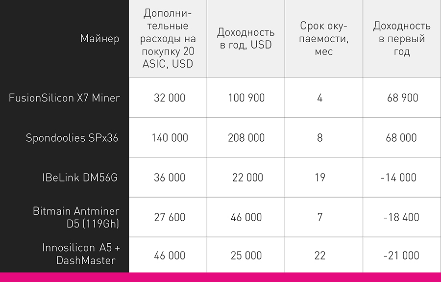 Таким образом, при фактически бесплатной розетке окупаемость для 20 майнеров алгоритма X11 в первый год будет выглядеть следующим образом.